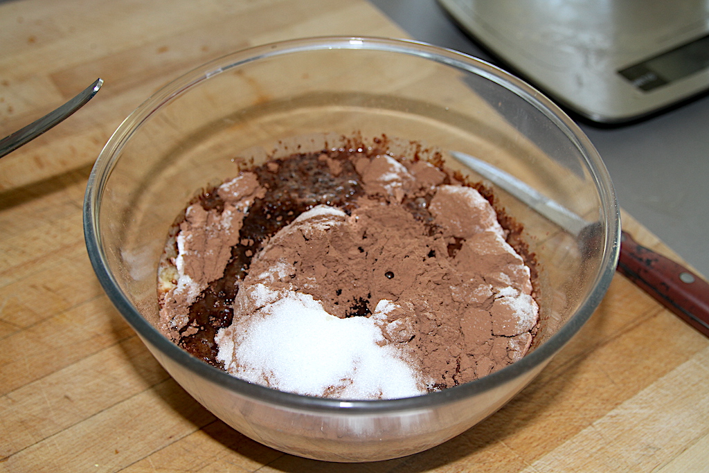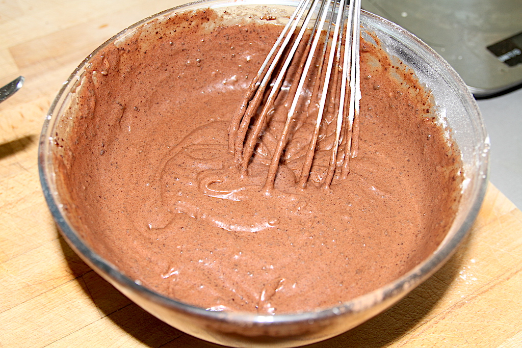Dans un saladier, mélangez les œufs, le cacao en poudre, le sucre, le lait et le beurre fondu.