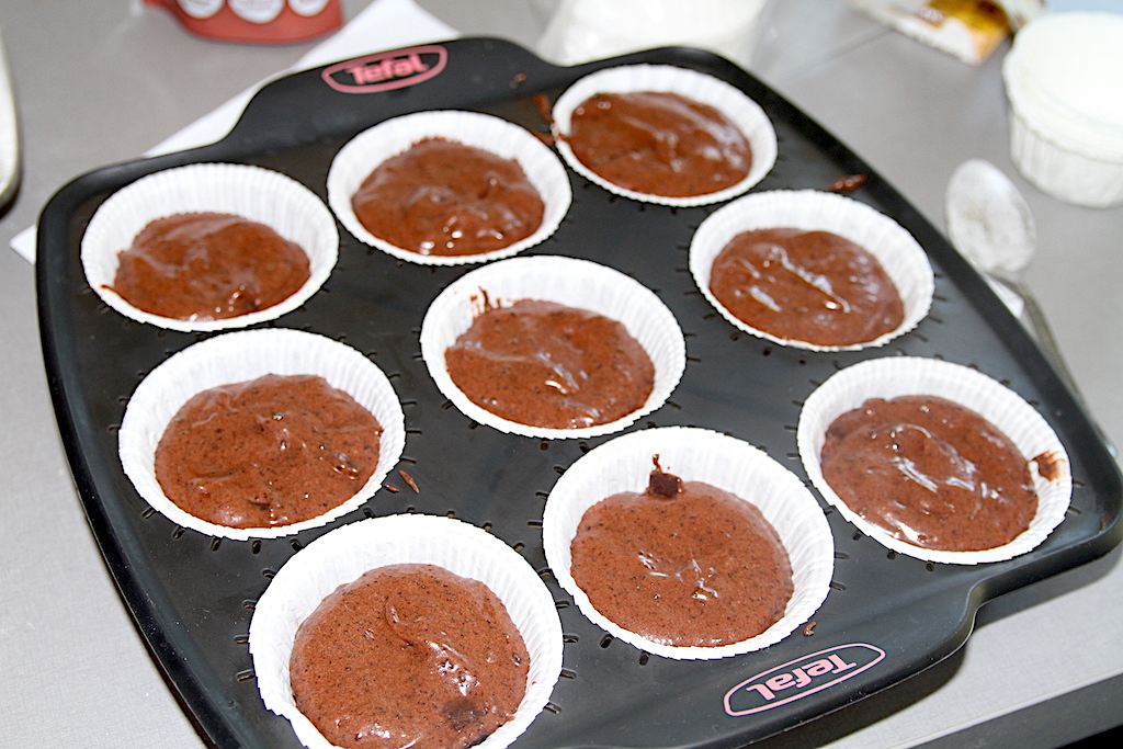Remplissez les moules à muffin au 3/4, pas besoin des papiers à muffin que vous voyez sur la photo.