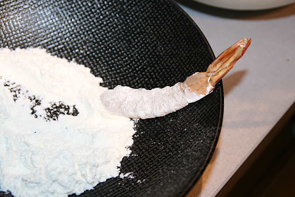 Passez une crevette dans un bol de farine, tapotez pour enlever l’excédent.